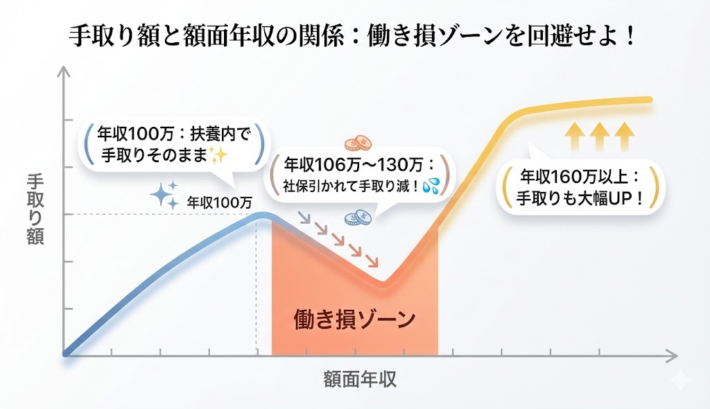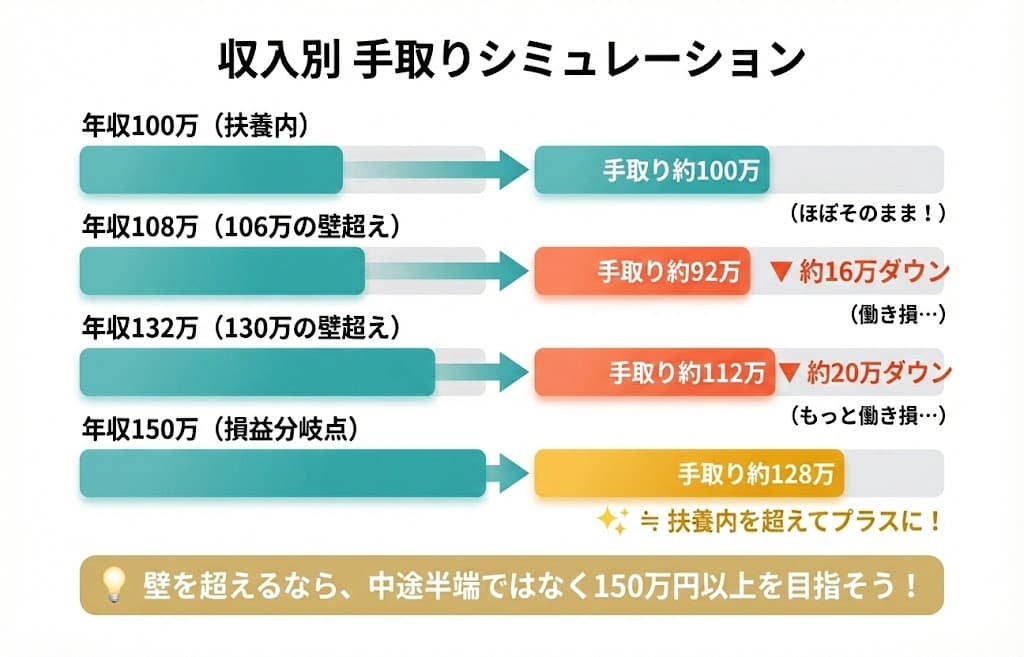 特に、106万円(または130万円)から150万円の範囲で働くと、社会保険料の負担だけが重くのしかかり、働く時間を増やしたのに手取りが減ってしまう「働き損」になりがちです。