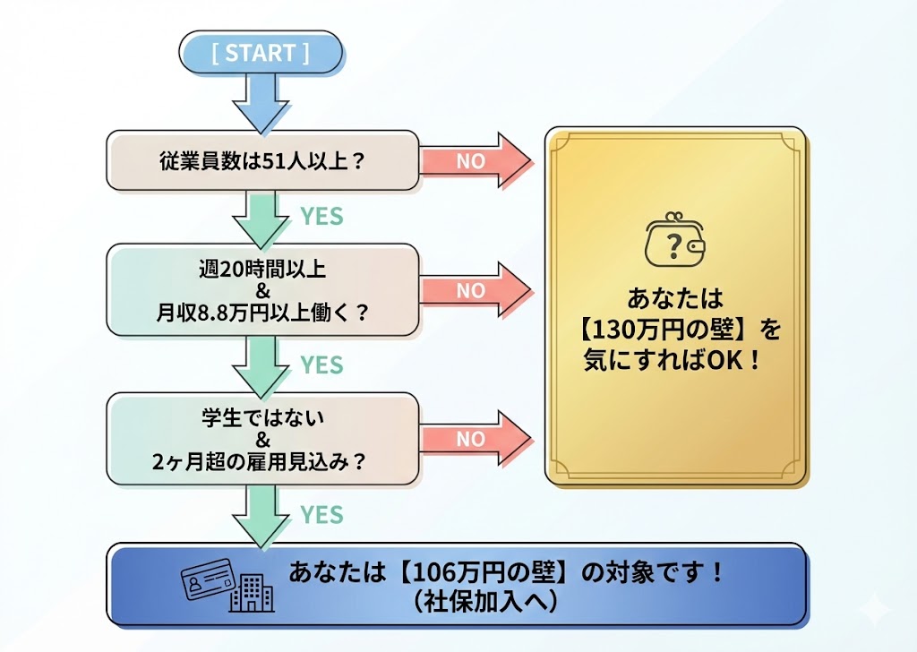 勤務先の従業員数が51人以上で、週20時間以上・月収8.8万円以上などの条件を満たす場合は「106万円の壁」が適用されます。満たさない場合は、原則として「130万円の壁」で判断されます。自分がどちらに該当するかは、勤務先の総務や人事部に確認するのが確実です。