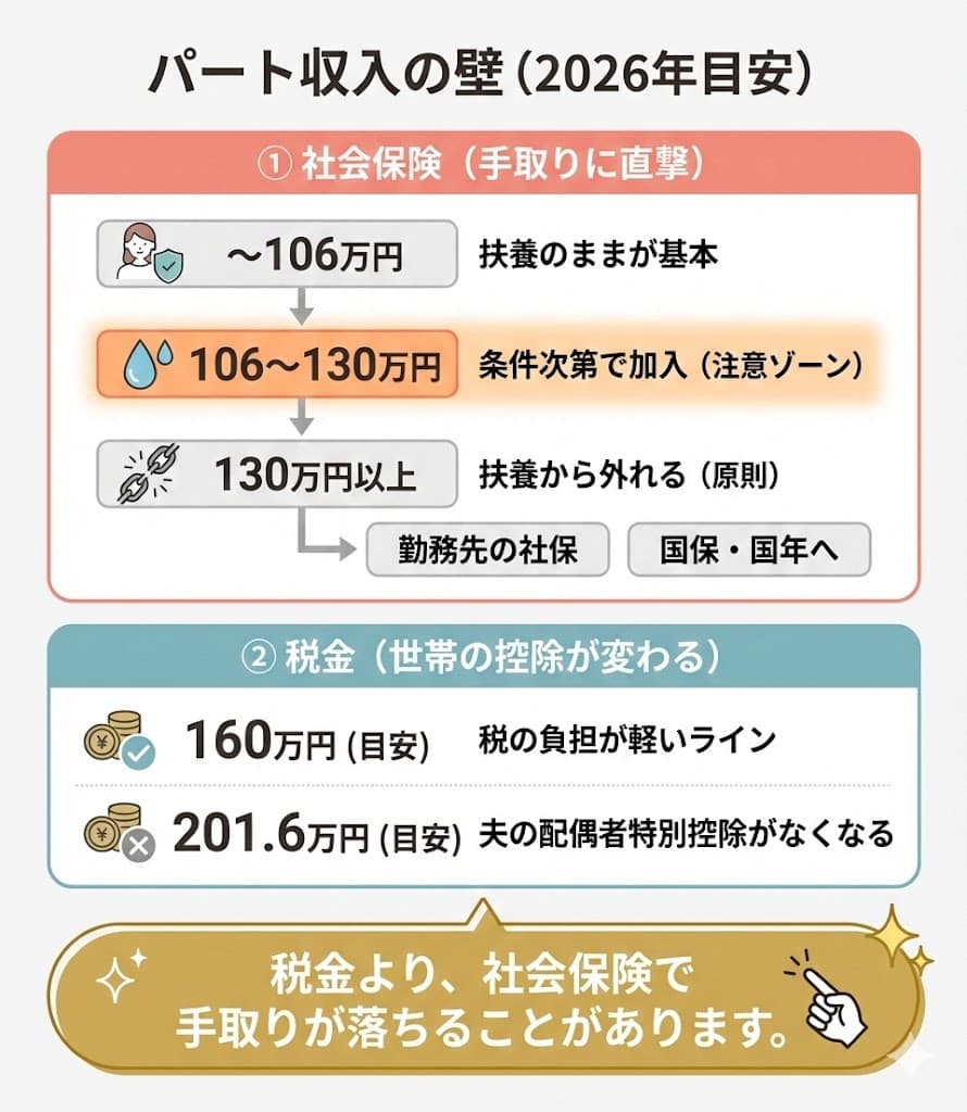 特に気になるのが「106万円の壁」と「130万円の壁」。これらを超えると社会保険に加入する必要があり、手取りが大きく減ってしまうケースがあります。
