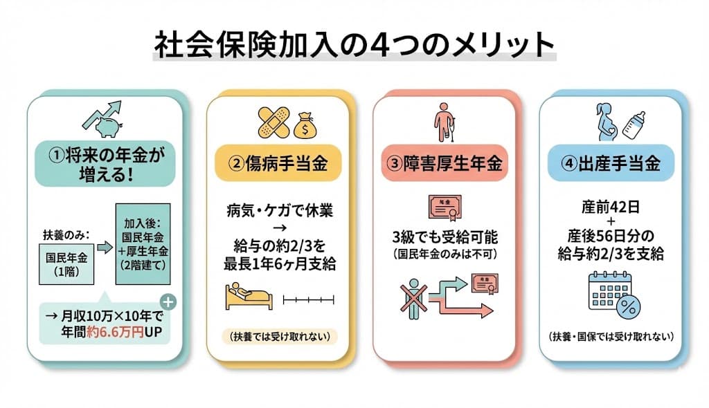 月収の約15%が社会保険料として引かれます。手取りを増やすなら中途半端に超えず、年収150万〜160万円以上を目指すのが賢明です。 - 社会保険には将来のメリットも確実にある