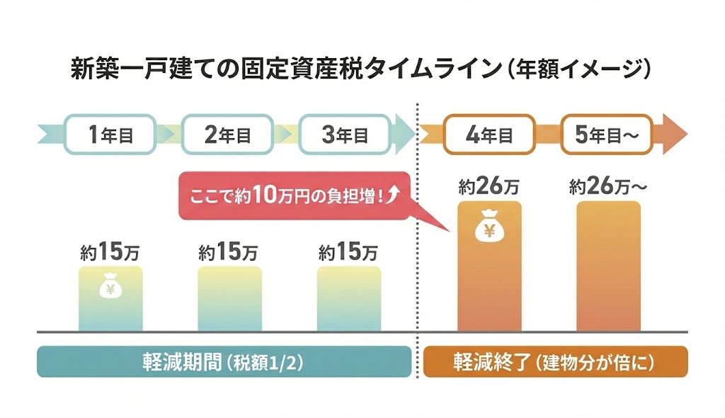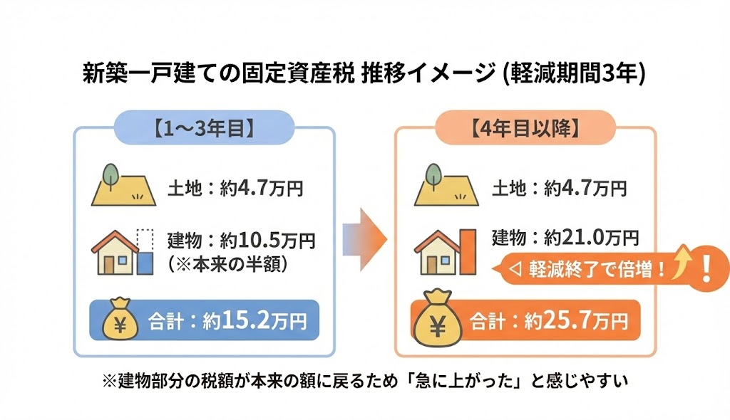 新築軽減期間が終わる4年目には、建物分の税金が半額から満額に戻るため、年間で約10万円の負担増となります。