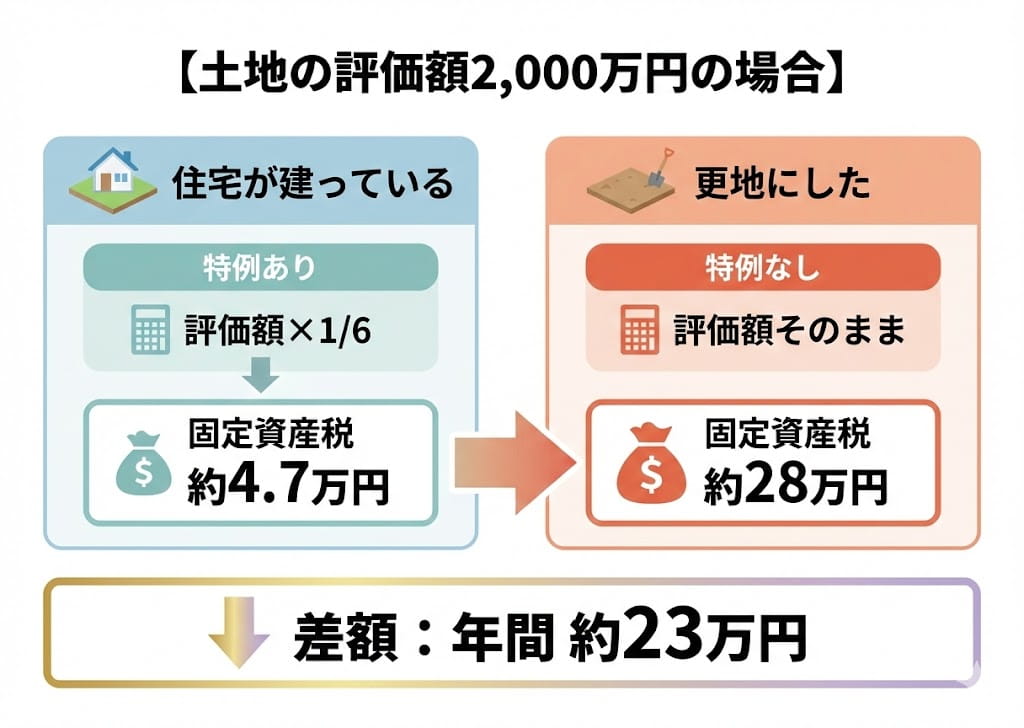 住宅を解体すると特例が外れるため、土地の固定資産税が約4.7万円から約28万円へ。その差は年間約23万円にもなります。建物を壊すかどうか判断する際は、この毎年の税金増を必ず考慮する必要があります。