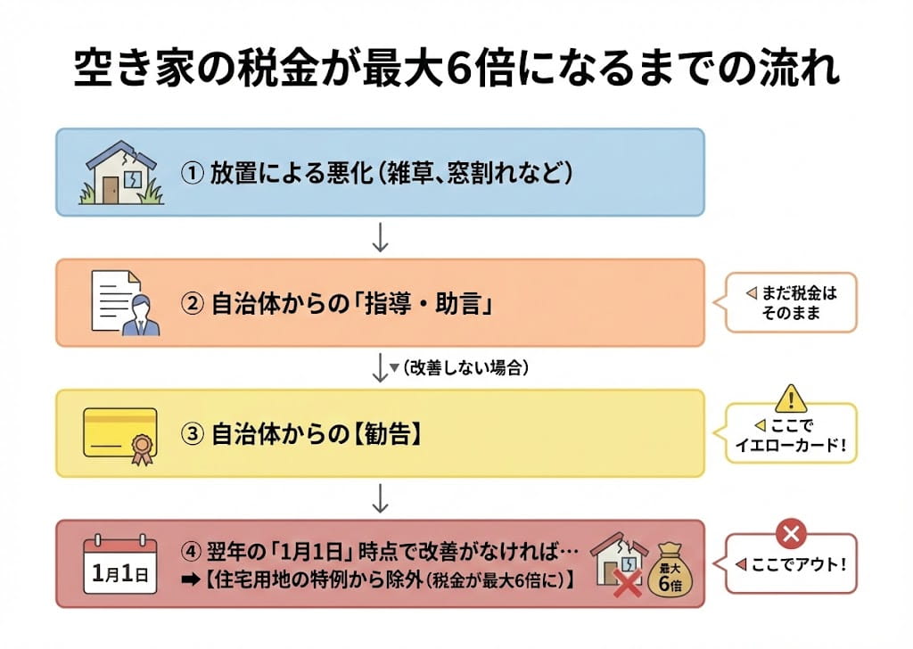 いきなり税金が上がるわけではありません。まず自治体から改善の指導や助言があり、それに従わずに「勧告」を受けると、翌年の1月1日(賦課期日)時点で改善されていない場合、特例の対象から外れてしまいます。