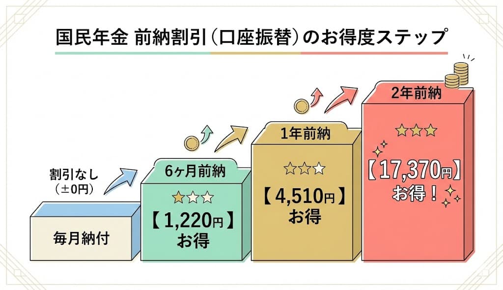 国民年金には「前納制度」があり、まとめて前払いすることで保険料が割引されます。まとまった出費にはなりますが、長い目で見ると確実に得する方法です。