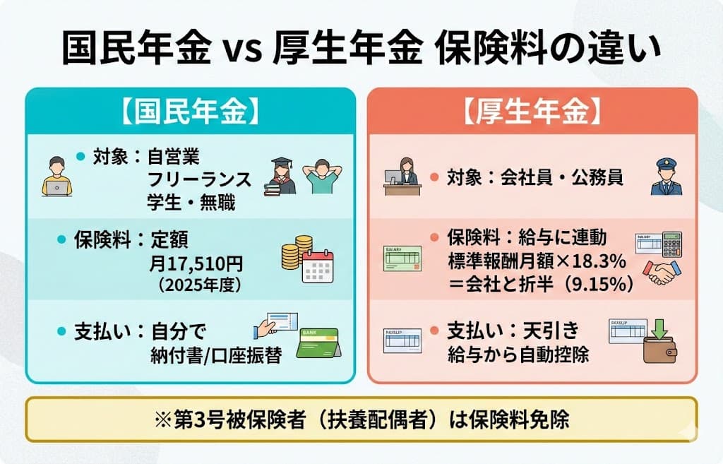 年金制度は「国民年金」と「厚生年金」の2つに分かれており、あなたの働き方によって保険料の仕組みがまったく異なります。会社員なら給与に応じて自動的に決まりますが、自営業やフリーランスの方は定額の保険料を自分で納める必要があります。