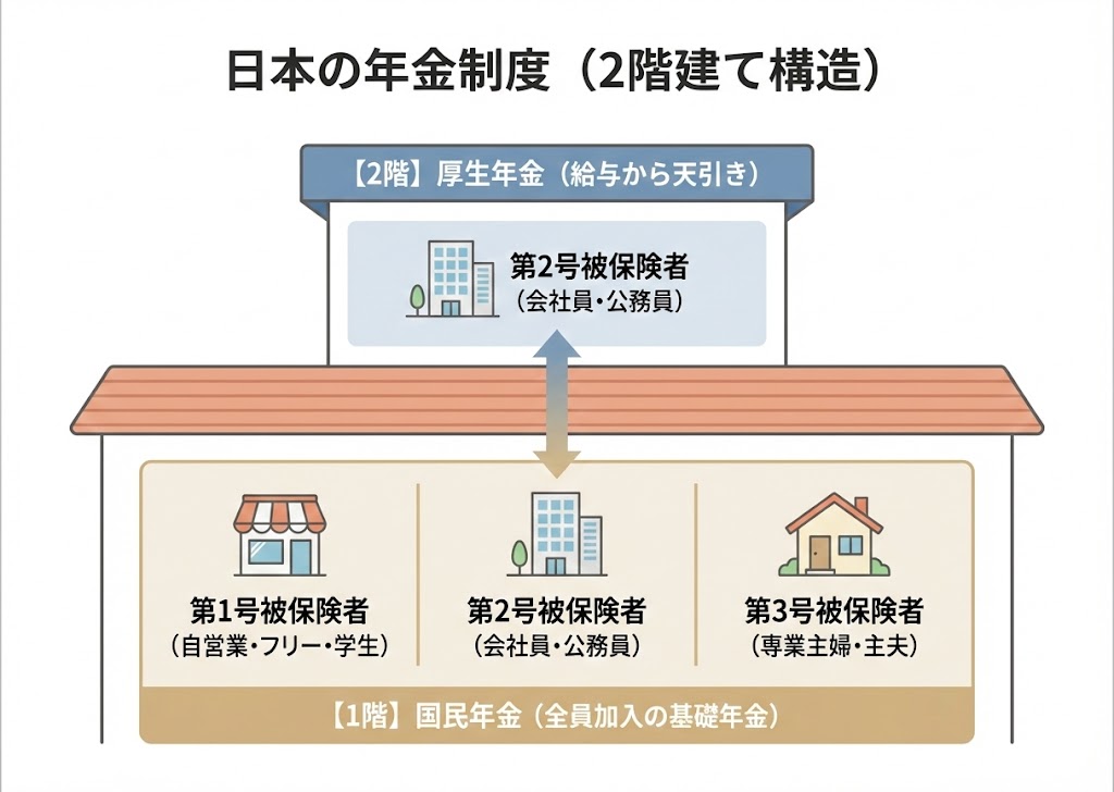 日本の公的年金は、大きく「国民年金(基礎年金)」と「厚生年金」の2階建て構造になっています。日本に住んでいる20歳から60歳未満のすべての人が、いずれかの形で加入する義務があります。