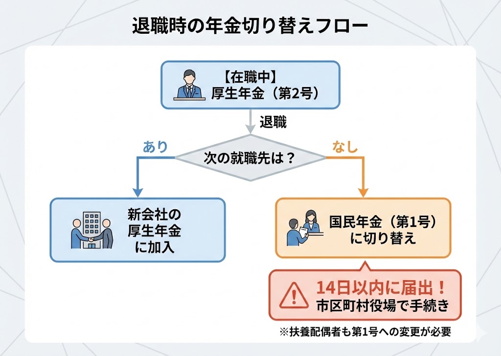 会社を退職すると、厚生年金の資格を失います。次の就職先が決まっていない場合は、自分で国民年金(第1号被保険者)への切り替え手続きが必要です。