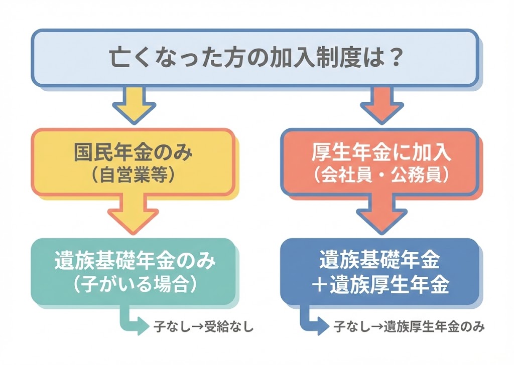 遺族基礎年金は受け取れず、遺族厚生年金のみが支給対象となります。夫が厚生年金に加入していなかった場合(自営業など)は、遺族年金を一切受け取れないケースもあります。