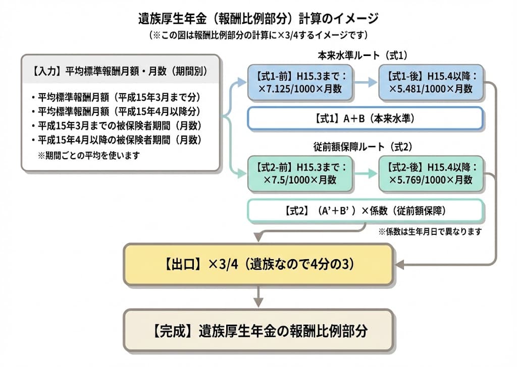 基本的には「老齢厚生年金の報酬比例部分の4分の3」が遺族厚生年金の額です。