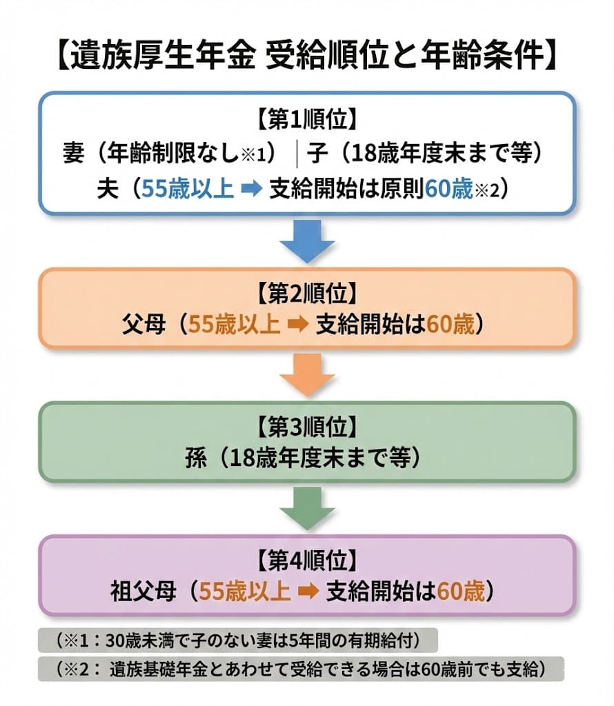 | 対象となる遺族 | 子のいる配偶者、または子 | 妻、子、孫、55歳以上の夫・父母・祖父母 |