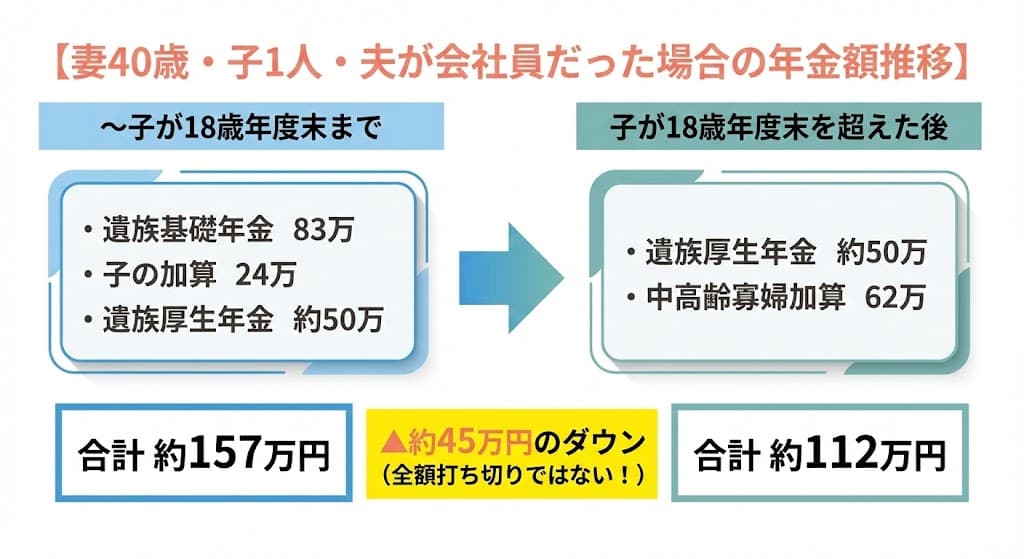 遺族基礎年金は18歳到達年度の末日で終了しますが、遺族厚生年金は継続して受け取れます。さらに、40歳以上65歳未満の妻には中高齢寡婦加算(2026年度は年額635,500円)が支給されます。全額打ち切りにはなりません。