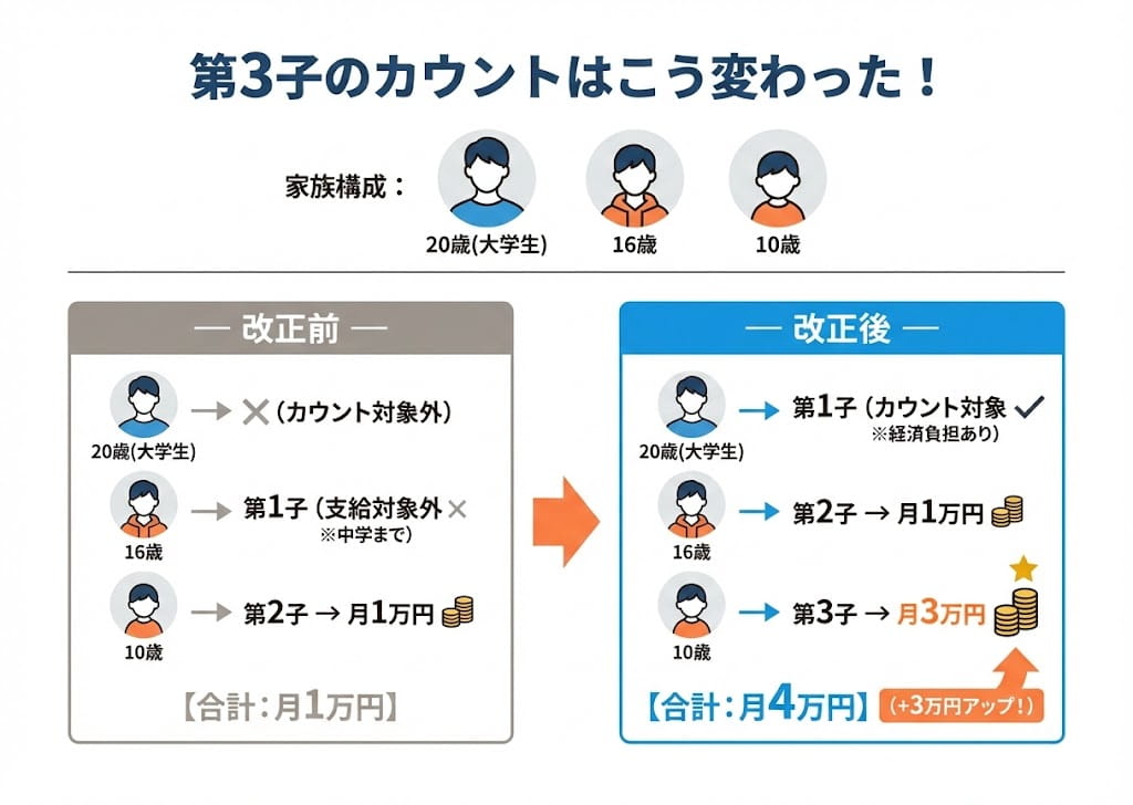もし20歳の子をカウントできなければ、10歳の子は「第2子」扱いとなり月額1万円。カウントの有無で月2万円もの差が出ます。