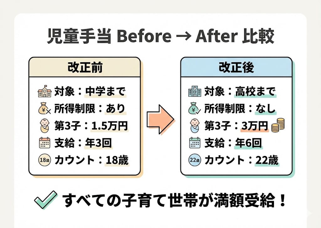 所得制限は完全撤廃。支給対象は高校生年代まで拡大。第3子以降は月3万円に倍増。さらに、支給回数も年6回に増えています。
