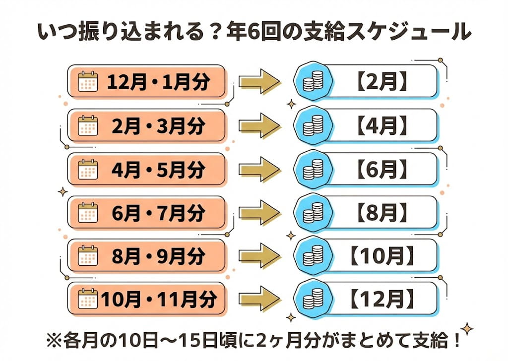 支給回数は年6回です。偶数月に前月までの2か月分がまとめて振り込まれます。