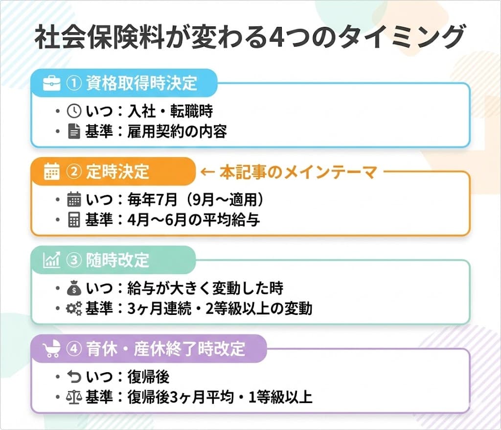 社会保険料は、定時決定だけで決まるわけではありません。以下の4つのタイミングで変更される可能性があります。