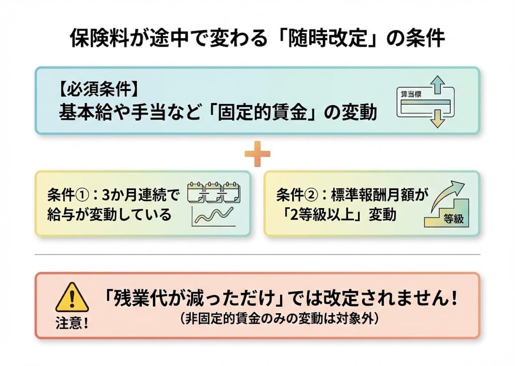 ここで重要なのは、「固定的賃金」の変動が必須条件であることです。残業代(非固定的賃金)が減っただけでは、随時改定の対象になりません。