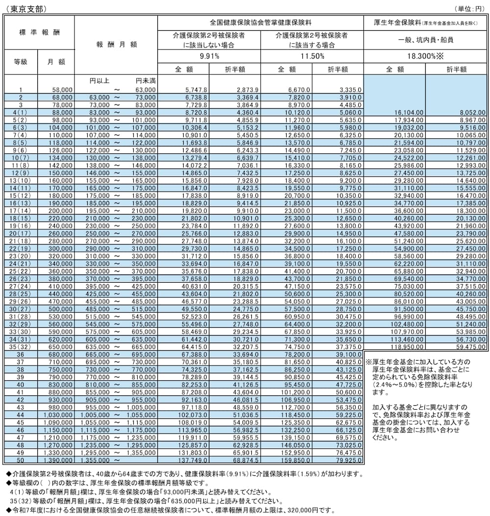 - 全国健康保険協会(協会けんぽ)「令和7年3月分(4月納付分)からの健康保険・厚生年金保険の保険料額表」