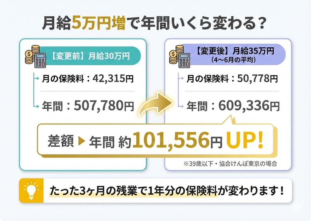 「4月〜6月に残業が多いと保険料が上がる」とは言いますが、実際にどれくらいの差になるのでしょうか。具体的な金額で見てみましょう。