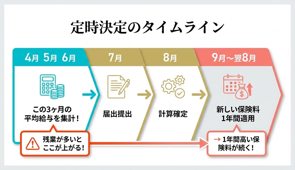 これは単なるウワサではなく、社会保険料の仕組みに基づいた事実です。健康保険料と厚生年金保険料は、4月・5月・6月の3か月の平均給与をもとに毎年再計算され、9月から翌年8月まで1年間固定されます。