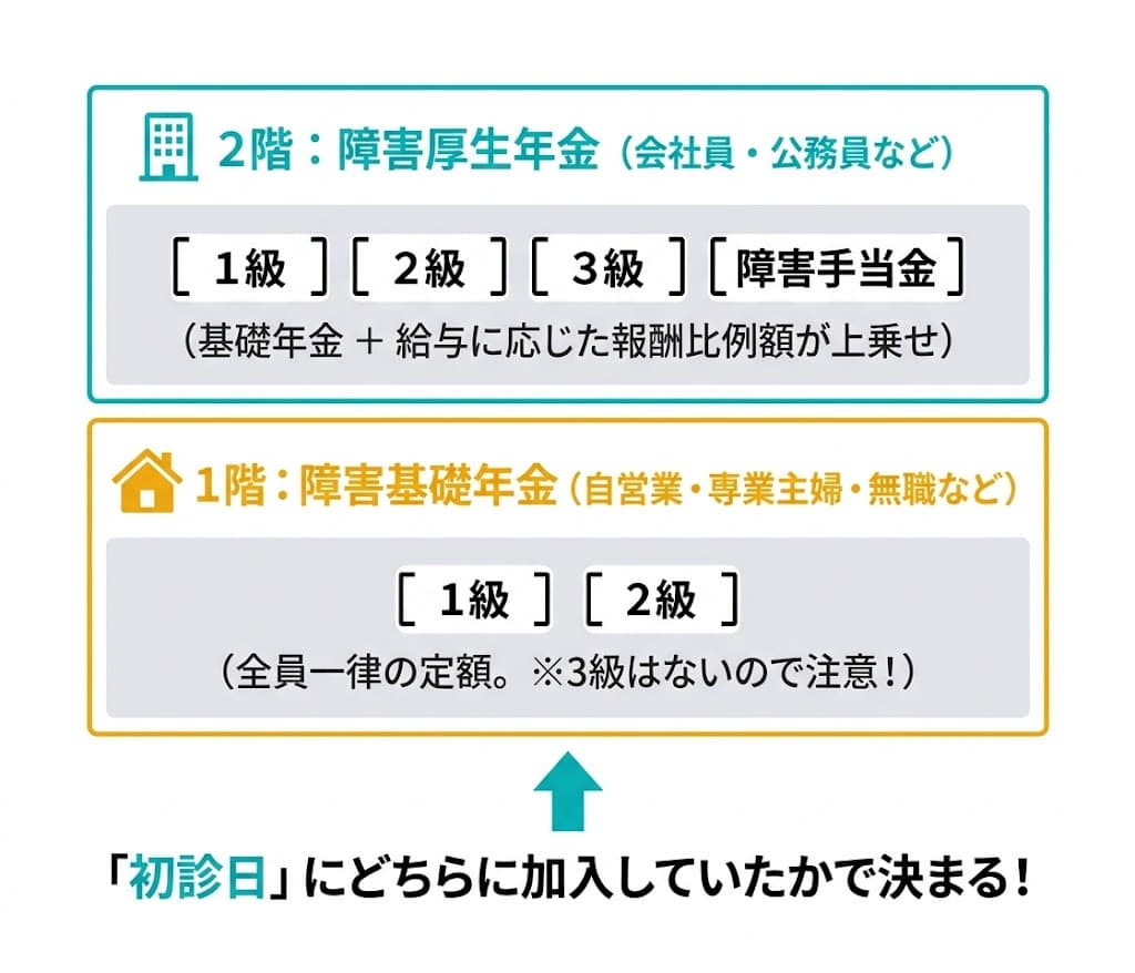 障害年金は、初めてうつ病で病院にかかった日(初診日)にどの年金制度に加入していたかによって、もらえる年金の種類が変わります。