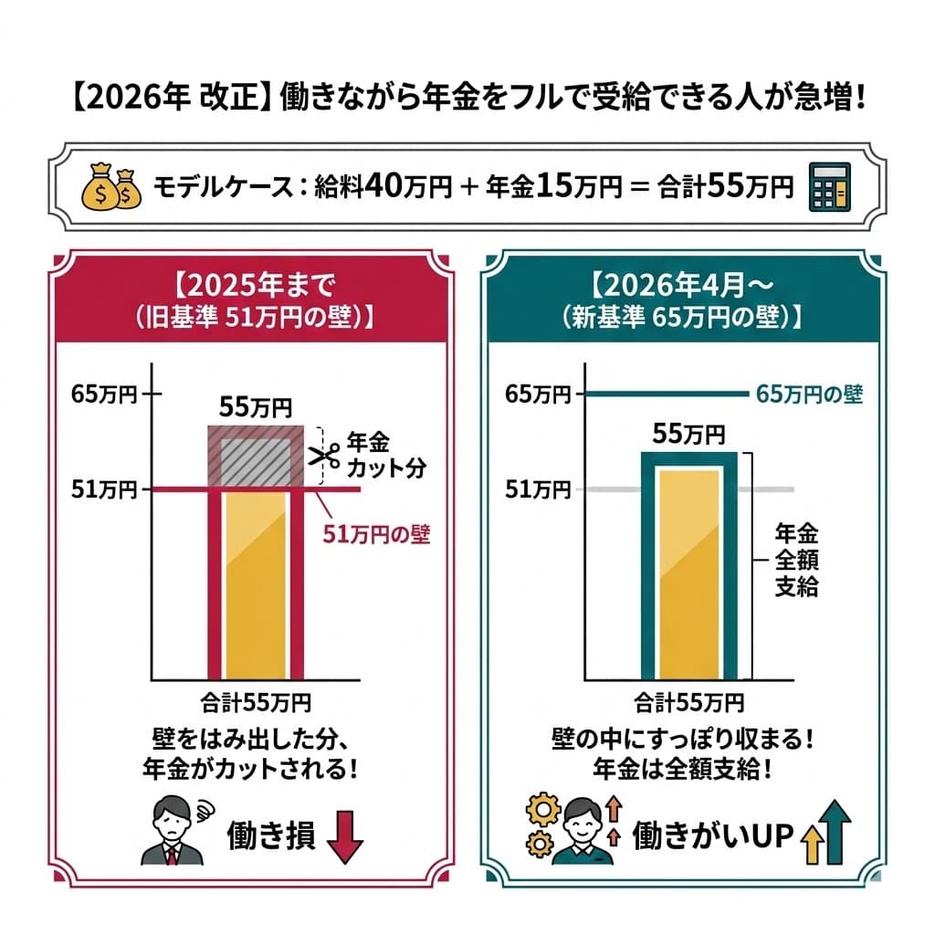 つまり、賞与を含めた平均月給が40万円+厚生年金15万円=合計55万円のような方は、2026年以降は年金カットゼロで全額受け取れるようになります。