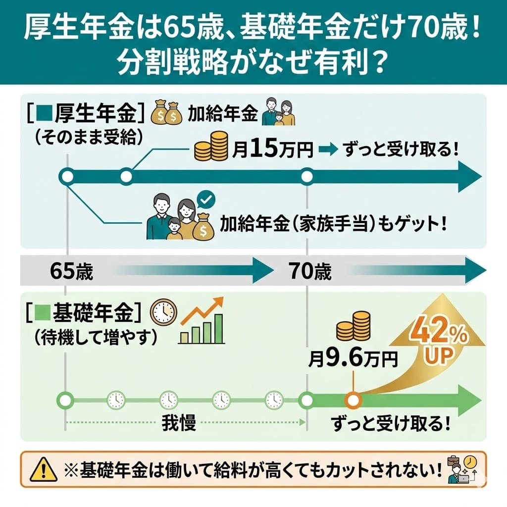 はい、できます。たとえば「厚生年金は65歳からもらい、基礎年金だけ70歳まで繰り下げる」という選択も可能です。加給年金を受け取りながら基礎年金を増やす「ハイブリッド戦略」として有効です。ただし、繰り上げの場合は両方同時に繰り上げる必要があり、片方だけの繰り上げはできません。