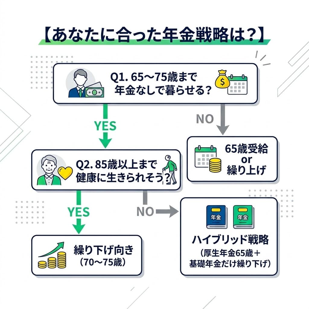 この3つに「Yes」が多い方は繰り下げ向き。「No」が多い方は65歳受給か繰り上げが現実的です。