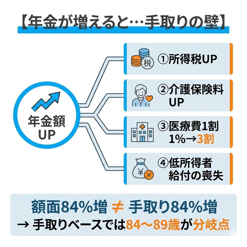 年金を繰り下げて額面が増えると、「やった、得した!」と思いたくなります。でも現実はそう甘くありません。額面が増えた分、以下の負担がまとめて襲いかかってきます。