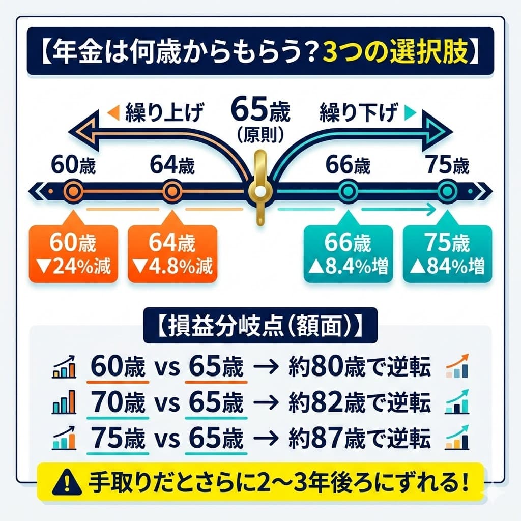 - 額面上の損益分岐点が約82歳でも、手取りベースでは税金や社会保険料の影響で数年後ろにずれ、84〜89歳頃になるケースが多い