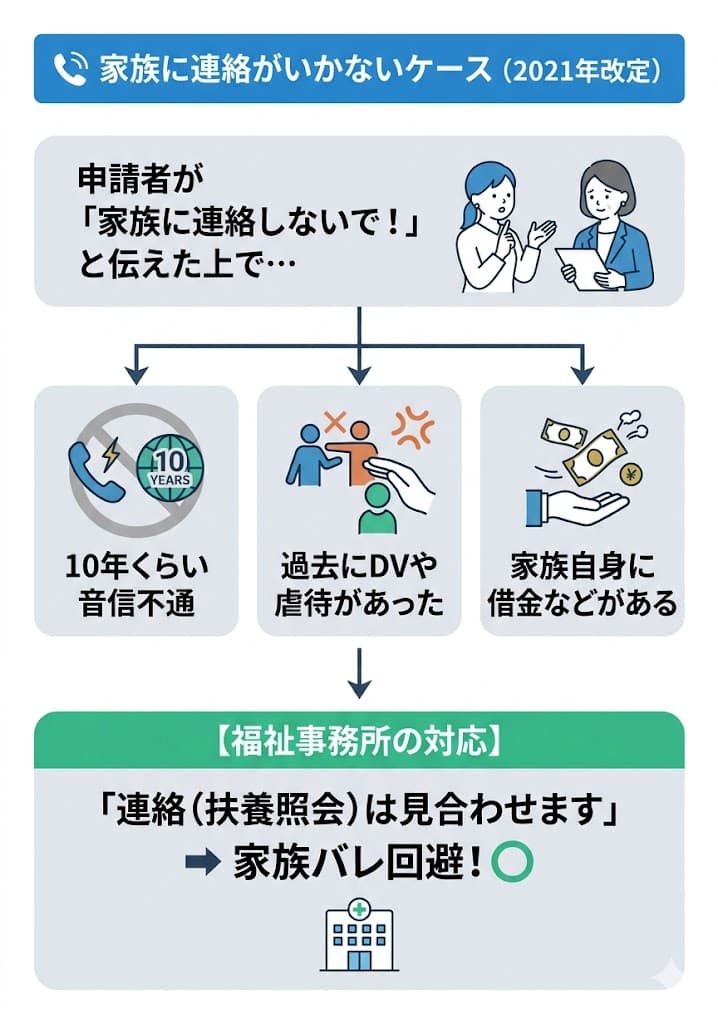 このルール変更により、本人に無断で親族へ連絡がいくリスクは大きく下がっています。