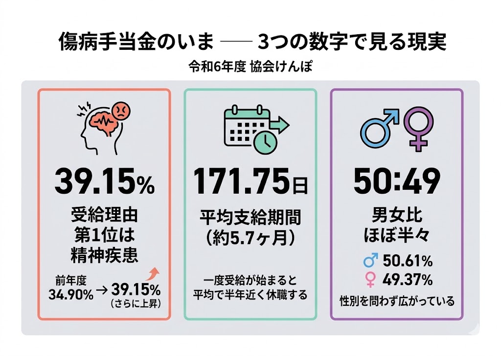 傷病手当金の支給が高い水準にある背景には、20代〜30代の若年層や働き盛りの世代を中心とした「精神疾患」の増加があります。令和6年度のデータでは精神疾患が全体の39.15%を占め、前年度からさらに上昇しました。平均支給期間は171.75日(約5.7ヶ月)と長期化しており、受給者の男女比もほぼ半々です。