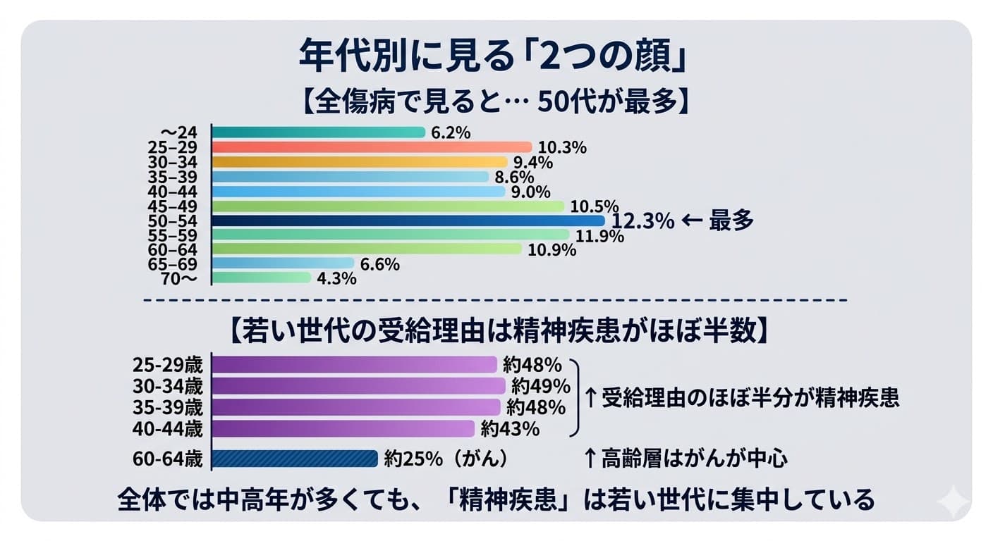 年代別の受給状況 ― 全体と精神疾患で「主役」が違う
